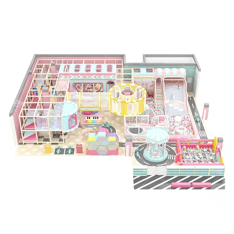 Distinguished by its distinctive macaron-inspired color scheme featuring a carefully curated palette of soft pastel hues including light blue, lavender, light pink, and light yellow, this custom-designed playground creates a visually engaging yet soothing environment that immediately captures children’s attention. The sophisticated color selection establishes a clean, fresh, and upscale atmosphere that promotes a sense of wellness through its elegant simplicity. Drawing inspiration from the vibrant world of French confectionery, the playground features brightly colored play structures that encourage physical activity while ensuring complete safety. The ground floor layout has been strategically designed to maximize play value through diverse activity options that stimulate creative exploration and imaginative scenarios, transforming the space into an enchanting destination where children naturally gravitate for extended play sessions.