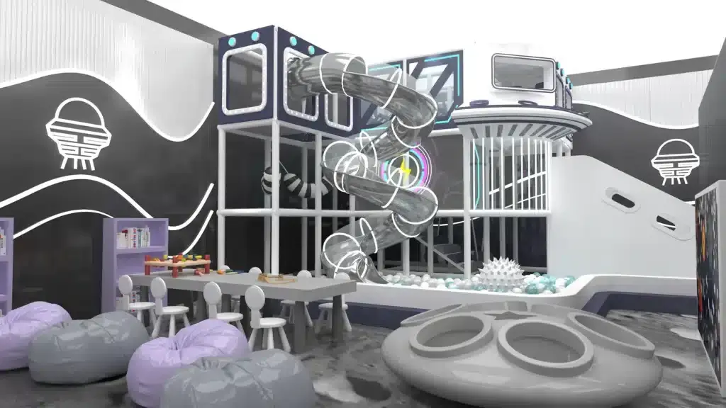 - Revenue Optimization: The layout is designed to maximize “dwell time.” By placing sitting areas and cafés with clear sightlines to play zones, parents stay longer, increasing food and beverage revenue.